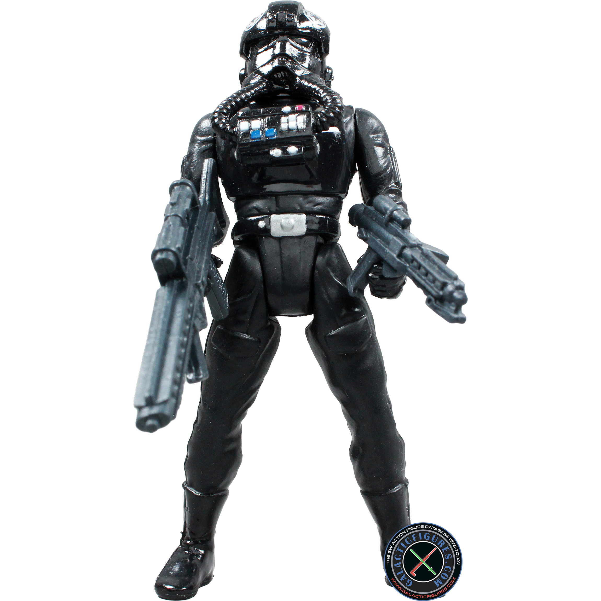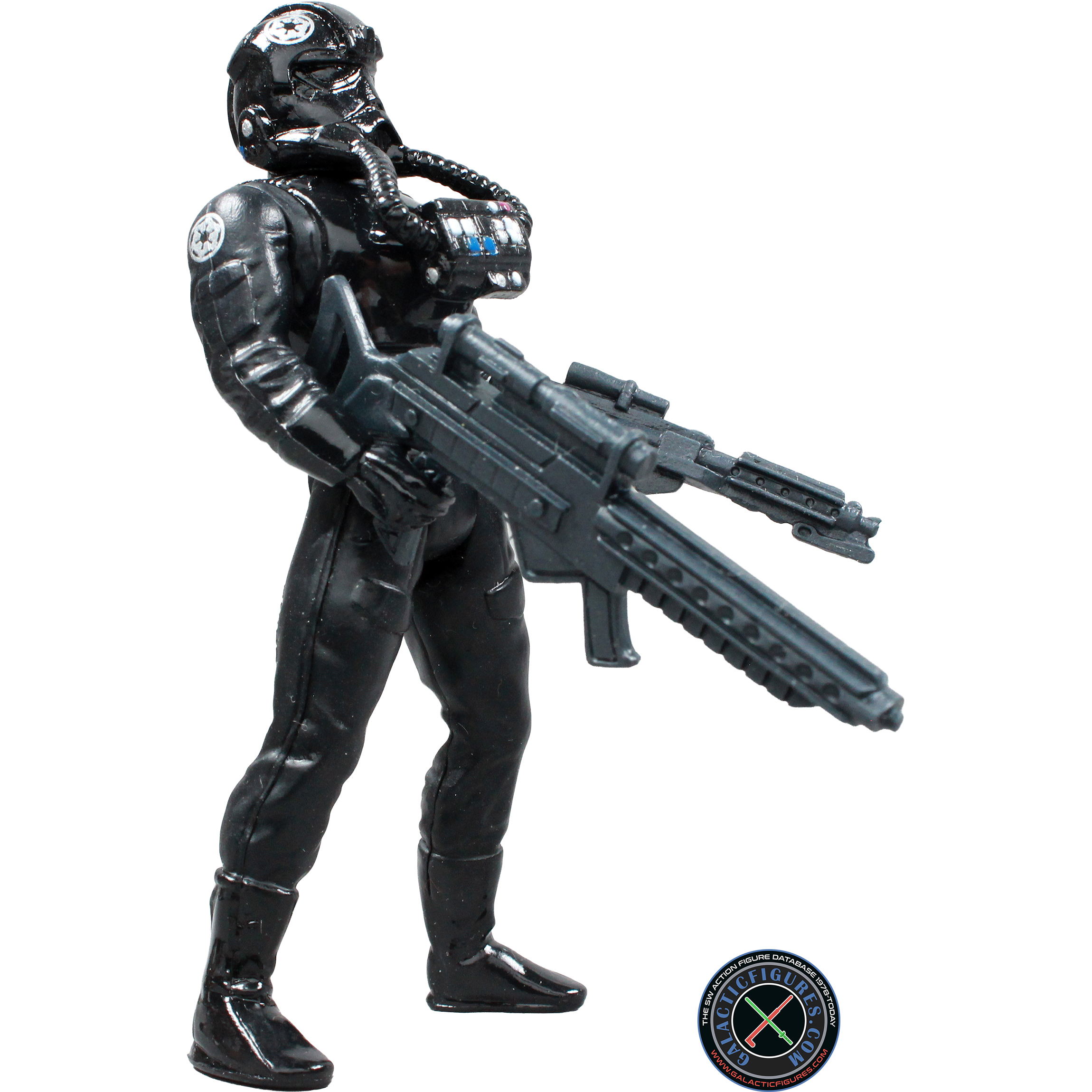 Unlike the Stormtroopers, TIE pilots wear black plasti-steel protective armor over an insulated high-gravity body glove. Their reinforced helemt features polarized lenses, a navigational computer link-up screen, a vocoder, and breathing filters. Two gas transfer hoses connect from the helmet to a chest plate control unit which contains an emergency atmospheric unit and control switches for the armor functions. Tightly sealed wrist gauntlets allow dexterity in handling TIE Fighter controls, while positive-gravity pressure boots keep the pilot well anchored even in zero-gravity situations.