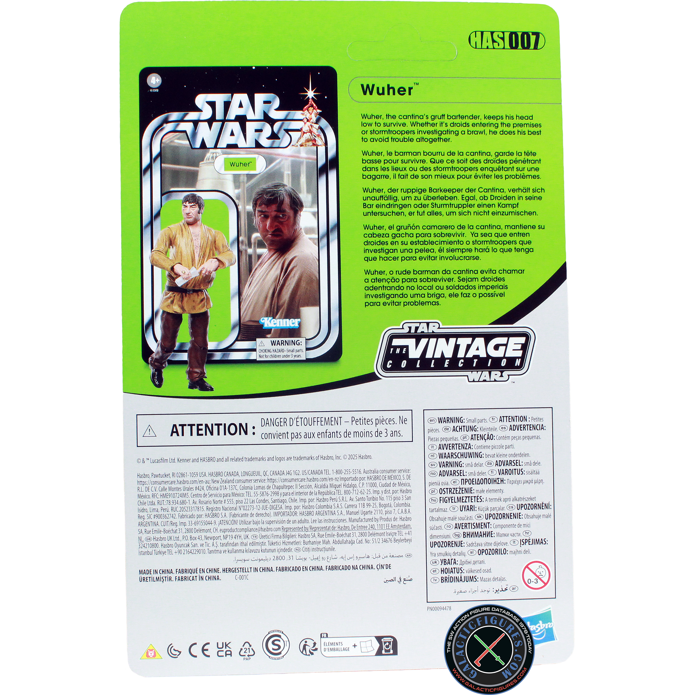 This Wuher figure was released single carded as part of the Vintage Collection Mos Eisley Cantina HasLab project in September 2025