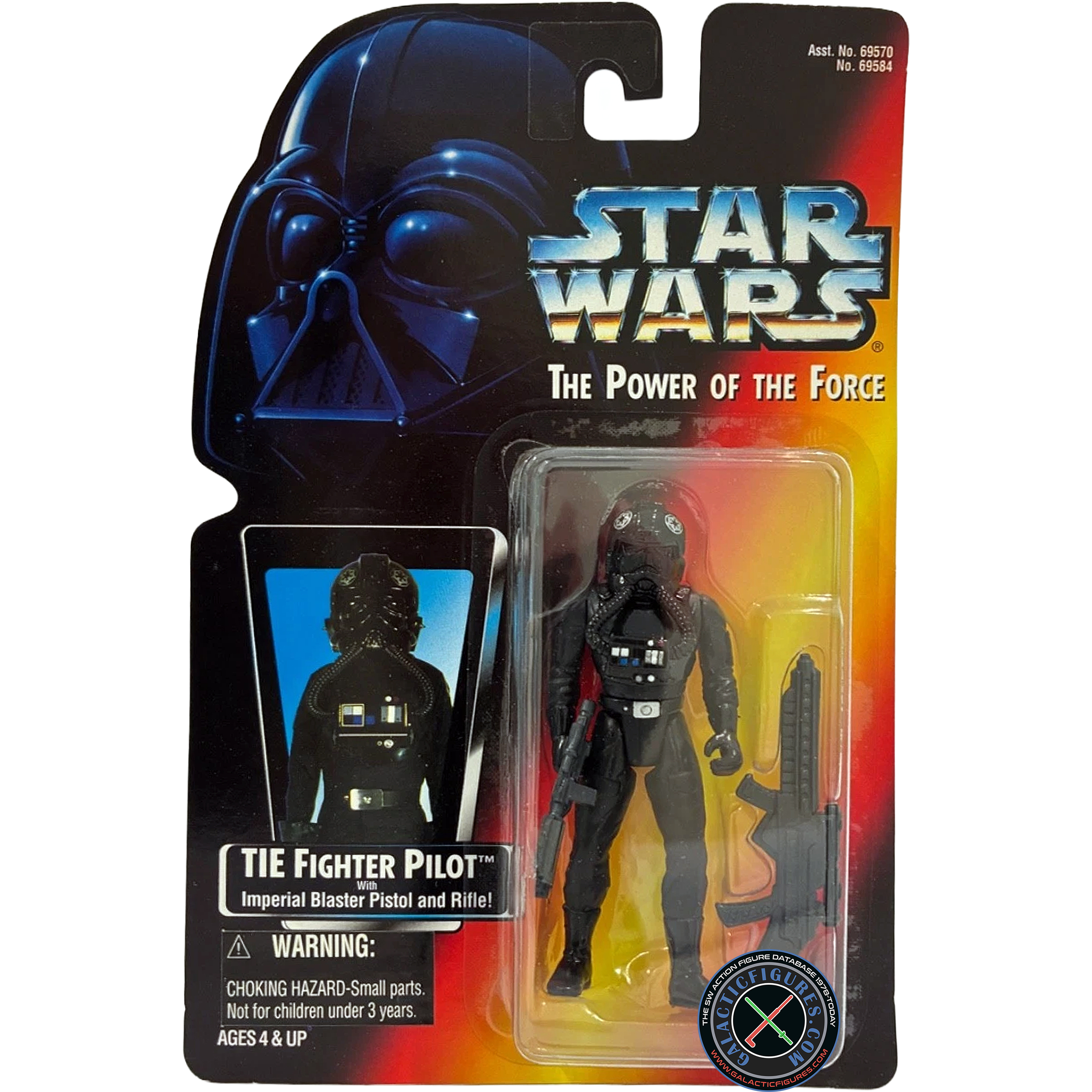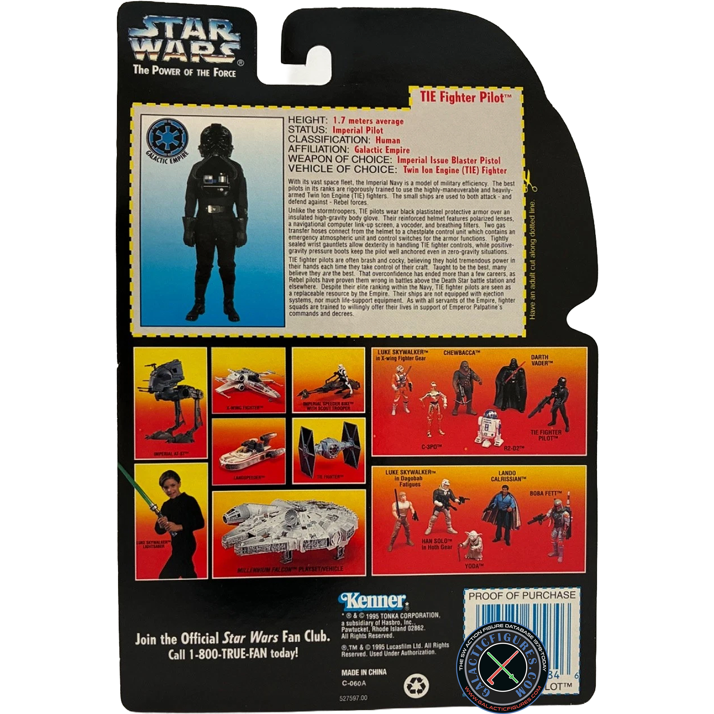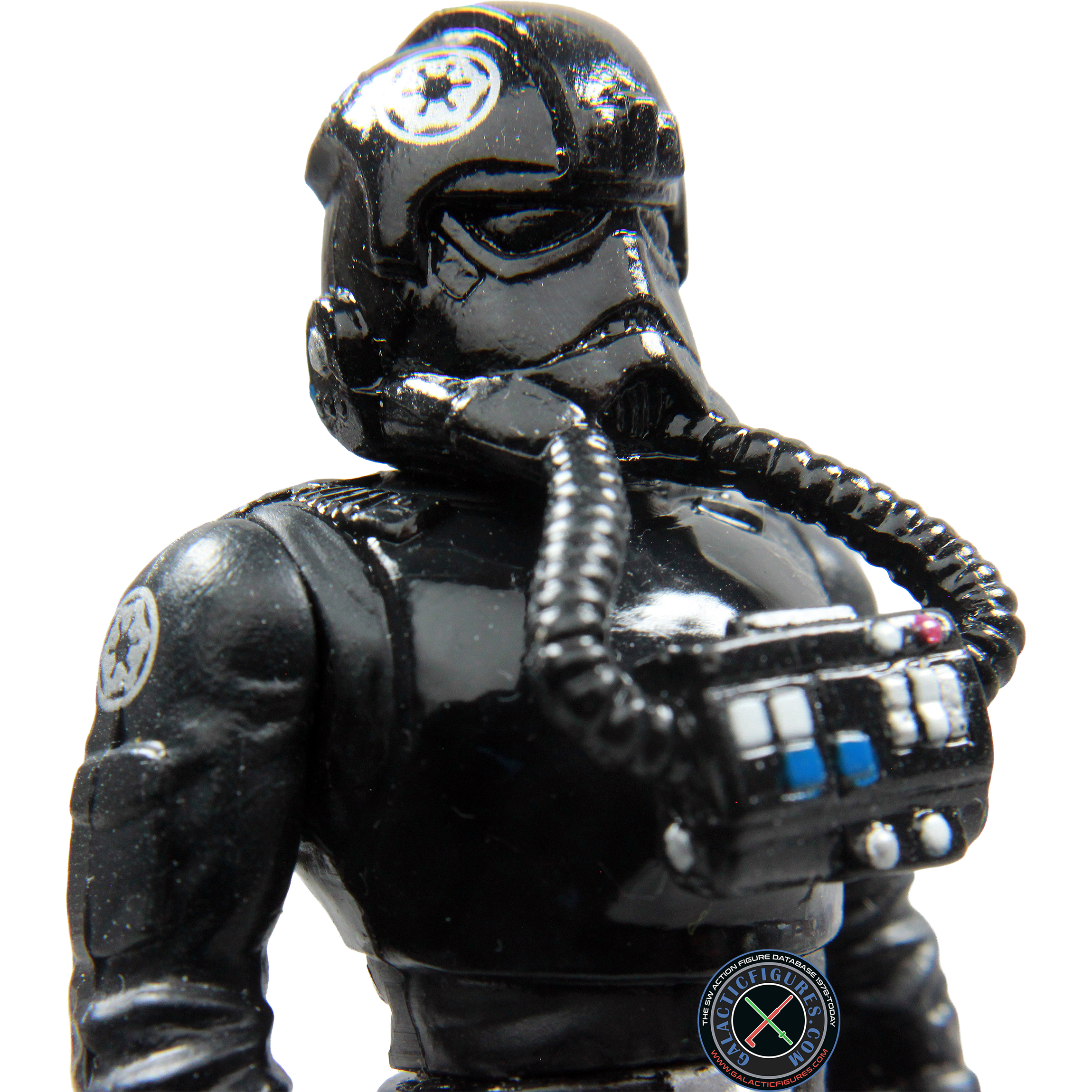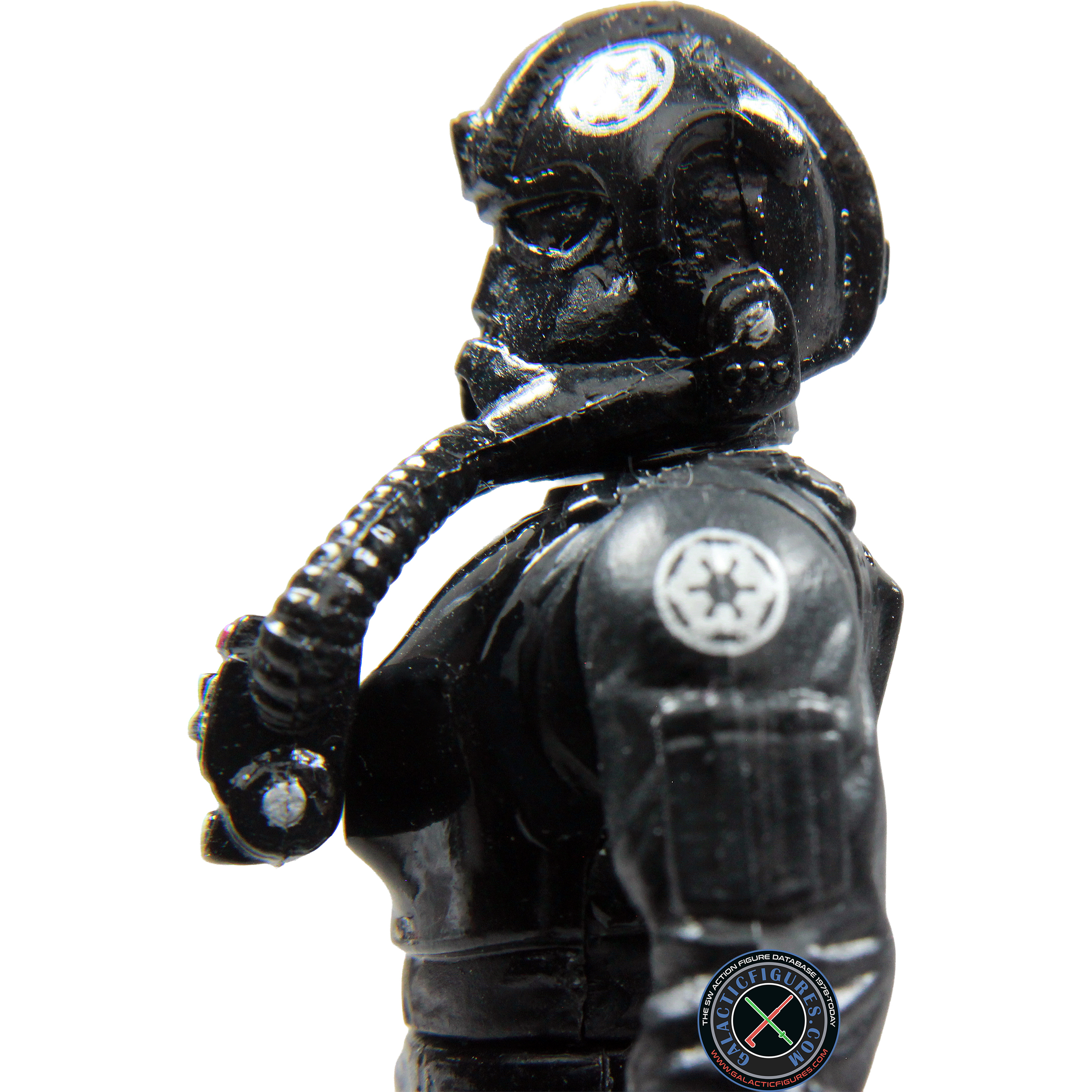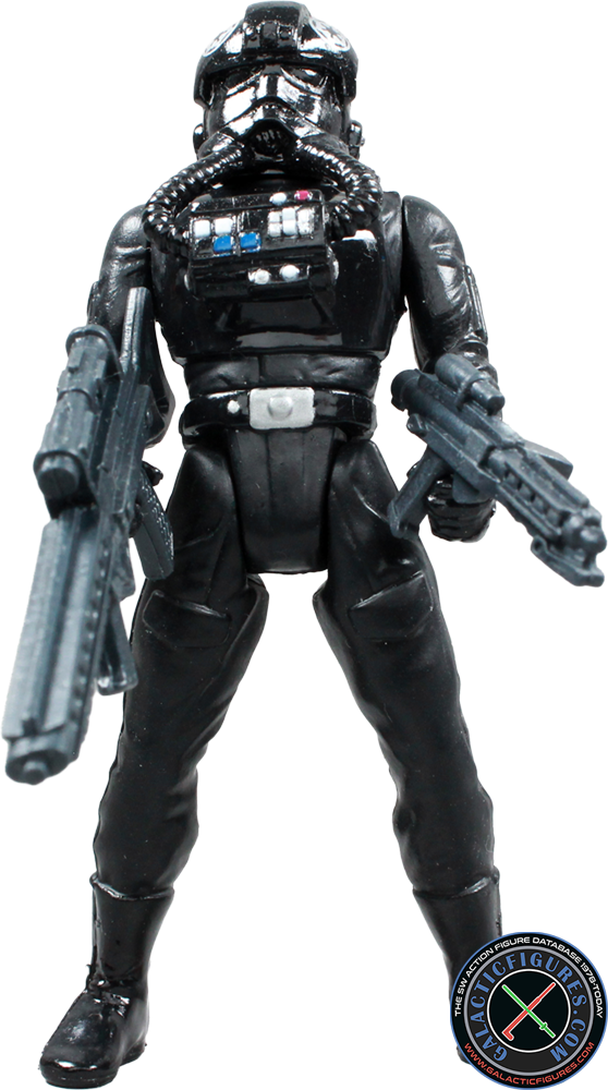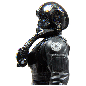 Unlike the Stormtroopers, TIE pilots wear black plasti-steel protective armor over an insulated high-gravity body glove. Their reinforced helemt features polarized lenses, a navigational computer link-up screen, a vocoder, and breathing filters. Two gas transfer hoses connect from the helmet to a chest plate control unit which contains an emergency atmospheric unit and control switches for the armor functions. Tightly sealed wrist gauntlets allow dexterity in handling TIE Fighter controls, while positive-gravity pressure boots keep the pilot well anchored even in zero-gravity situations.