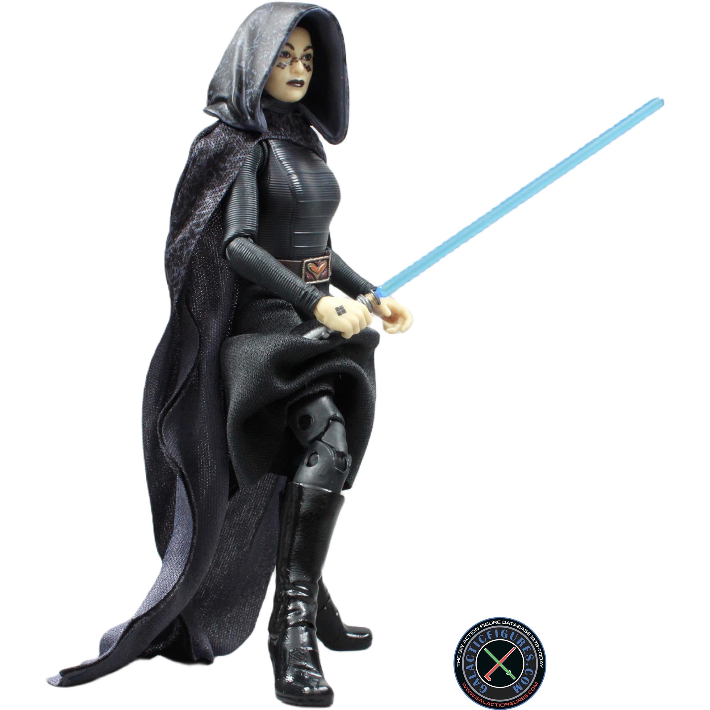 The Barriss Offee Black Series figure includes a removable plastic hood, a soft-goods Jedi robe, and a lightsaber with a detachable blade